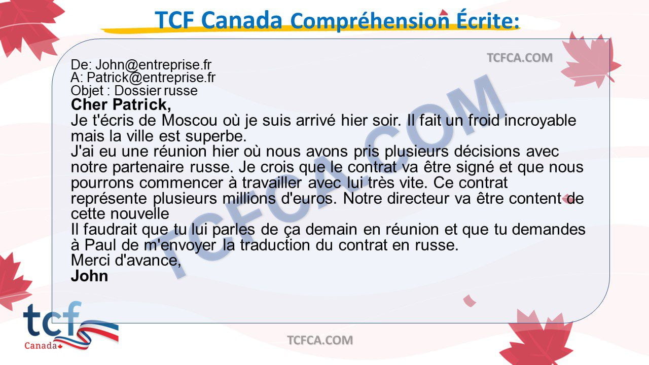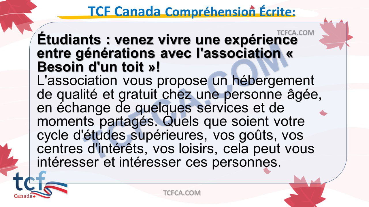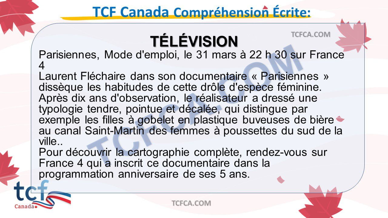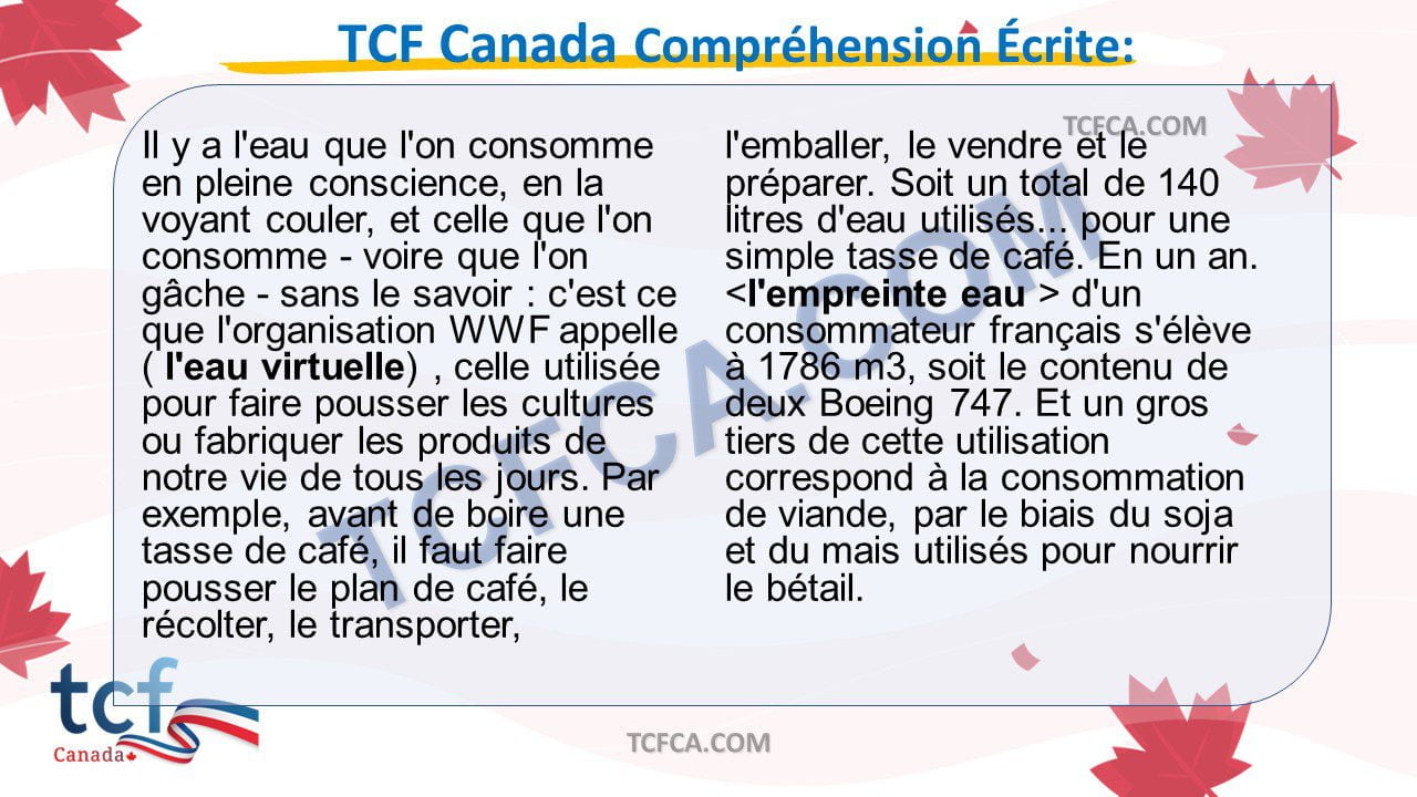 - Dans cette partie du TCF Canada, vous allez montrer votre compréhension du français écrit a partir de documents que vous pouvez rencontrer dans la vie quotidienne ou dans le monde professionnel.
