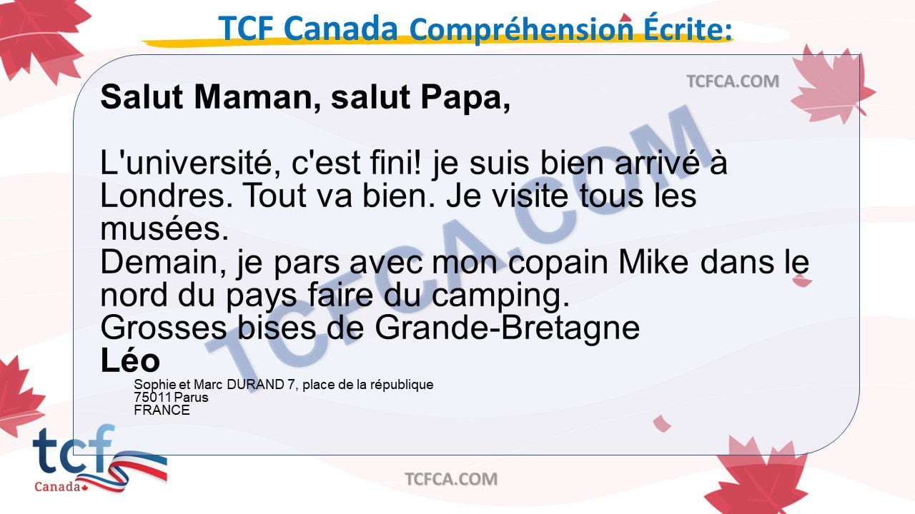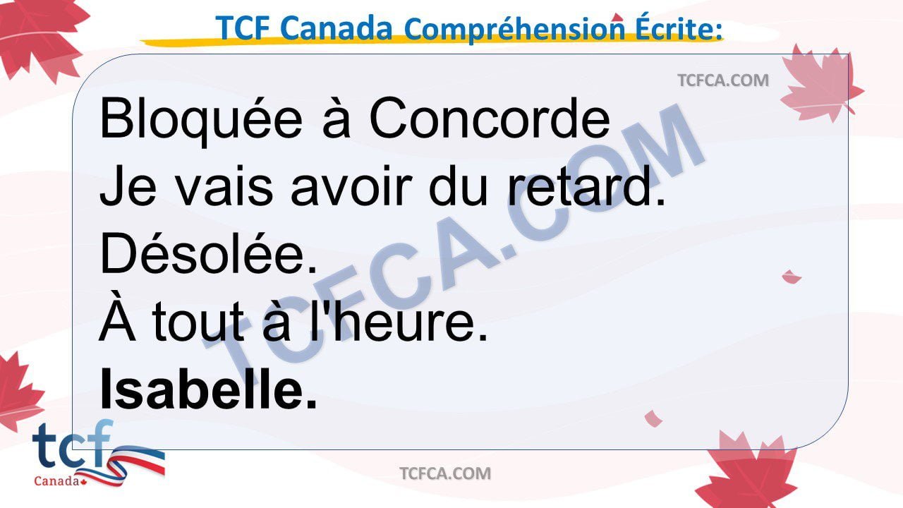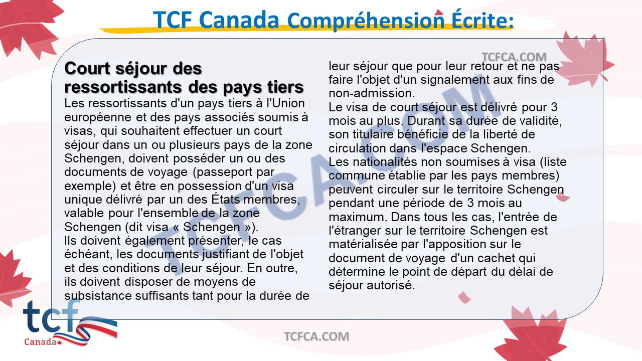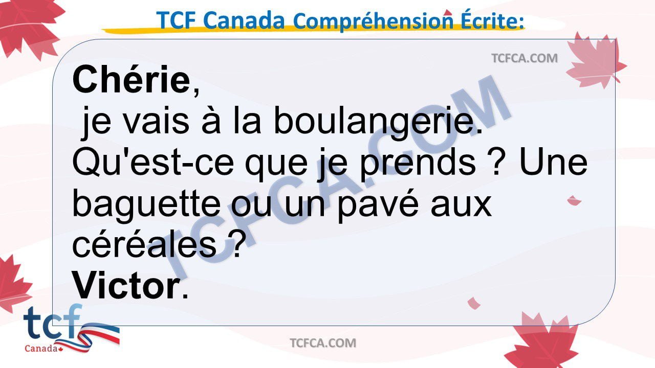 - Dans cette partie du TCF Canada, vous allez montrer votre compréhension du français écrit a partir de documents que vous pouvez rencontrer dans la vie quotidienne ou dans le monde professionnel.