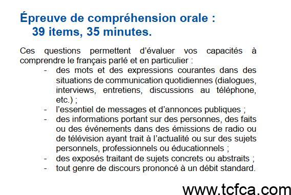 - Le TCF Canada est composé de 4 épreuves. Le TCF évalue les compétences en français langue générale en compréhension orale, en compréhension écrite, en production orale et en production écrite. Le TCF Canada se présente sous la forme de 39 questions à choix multiple pour la compréhension orale et 39 questions à choix multiple pour la compréhension écrite, chaque question du TCF canada n’ayant qu’une seule réponse correcte (toutes les questions de compréhension sont organisées par niveau de difficulté progressive) ; de 3 tâches pour la production orale, et de 3 tâches pour la production écrite. Le résultat obtenu au test donne lieu à la délivrance d’une attestation de niveau (valable 2 ans)